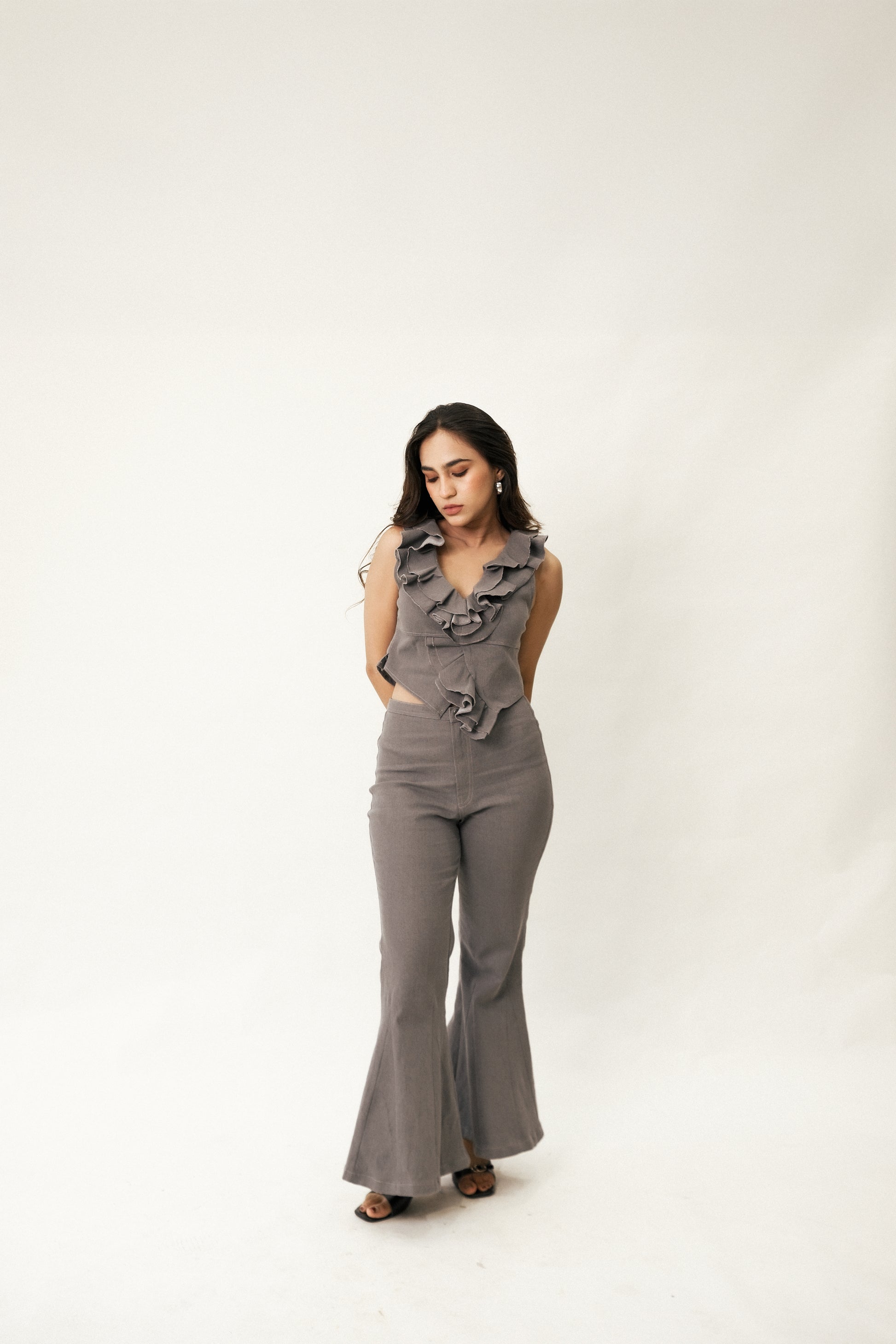 A chic grey denim co-ord set featuring a sleeveless frill-detailed top paired with high-waist flared pants.Sophisticated yet stylish, perfect for elevating day-to-night looks.