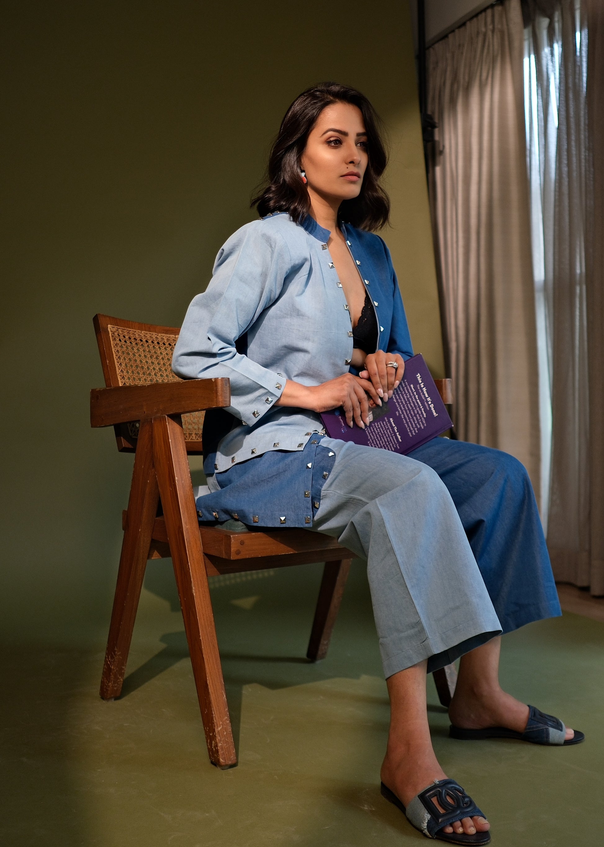 This cord set features a collarless open jacket in soft structured denim, embellished with pyramid stud detailing along the seams and sleeves. Oversized dual-tone pockets on the pants give it both utility and flair, while the rich contrast between light and deep indigo brings visual edge.